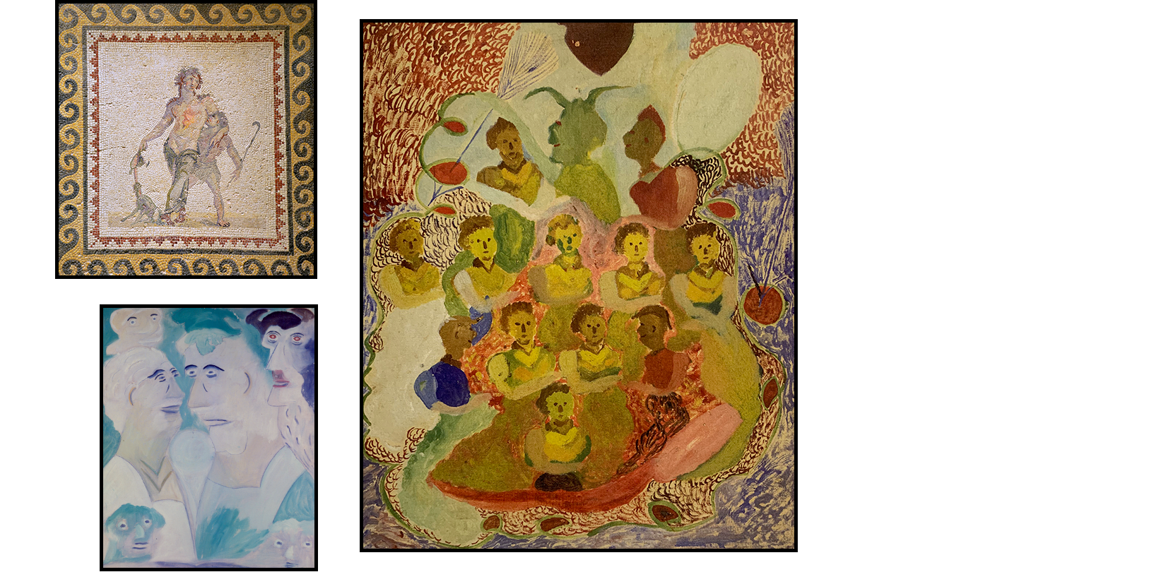 Mosaico de Dionísio, por volta de 220-230 d.C. Museu Romano-Germânico, Colônia, Alemanha | Carlos Pertuis . Dois velhos comunicam-se entre si e riem. Aquele que está no meio da tela usa vestes verdes e traz sobre a cabeça uma folha de vinha. Atrás dele, está uma figura humana com cornos negros e pescoço peludo. O Dionísio velho e a inseparável sombra do deus – o bode. . 1959 . óleo sobre tela 50 x 61 cm . Museu de Imagens do Inconsciente . Instituto Municipal Nise da Silveira | Carlos Pertuis . Grupo de mulheres que lembram bacantes, e sátiro. Essas figuras simbolizam as forças elementares da natureza, a vitalidade dos instintos. O sátiro, com seus cornos que o aproximam do animal, está pintado em verde, cor da vegetação, sugerindo ainda mais íntima conexão com a natureza. Por esses atributos, o sátiro pode representar aspectos do próprio Dionísio. . 1955 . óleo sobre tela 37,7 x 46 cm . Museu de Imagens do Inconsciente . Instituto Municipal Nise da Silveira